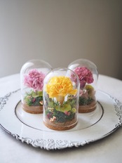ガラスドームの中にアレンジされているのに、その小さな空間の中に広がる世界観をお楽しみいただける愛らしいアレンジメントです。