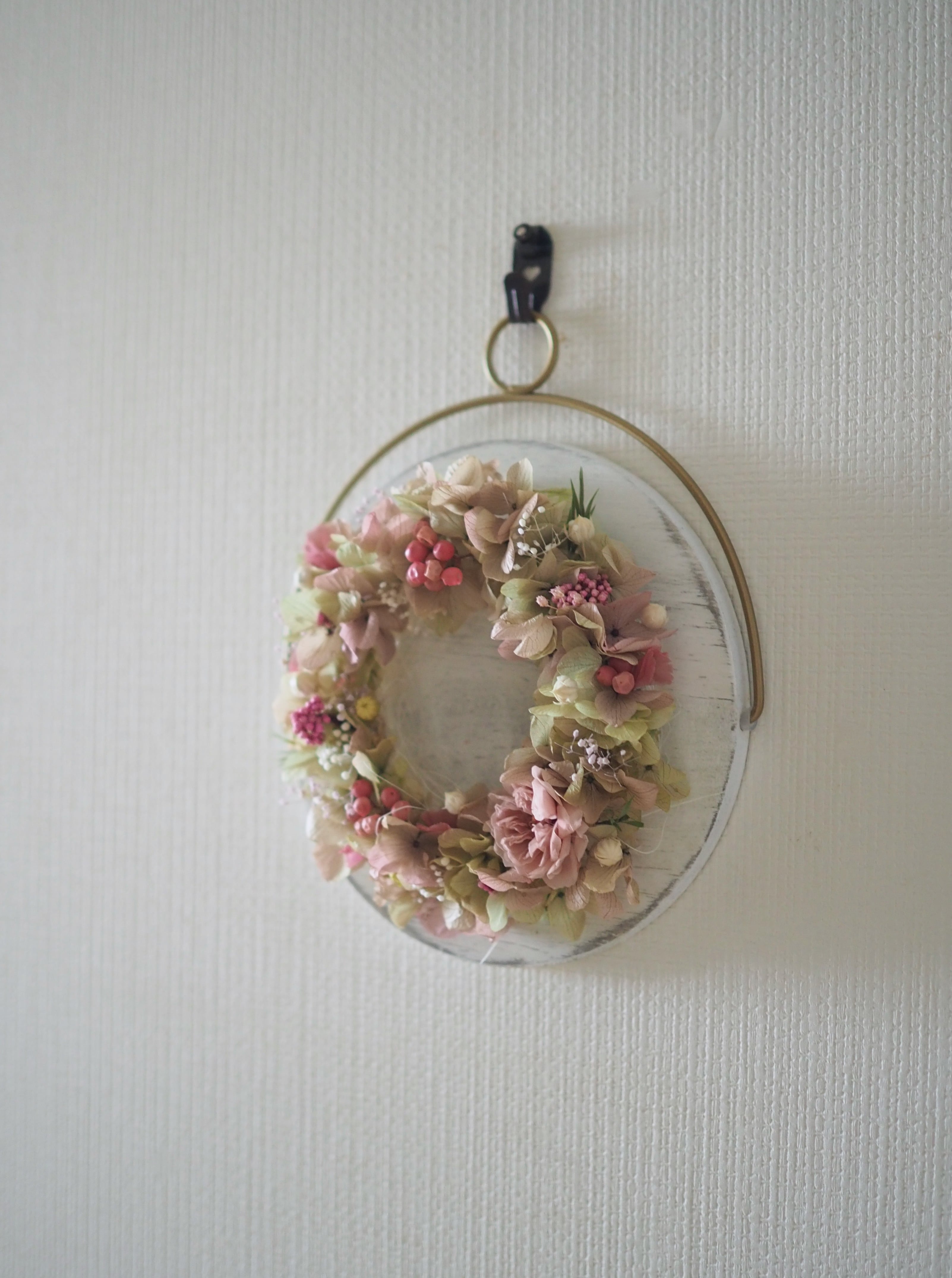 直径15cm程の丸いハンドル付きのプレートに、プリザーブドフラワーの紫陽花やライスフラワーなど小さなお花をリース状にアレンジしました。