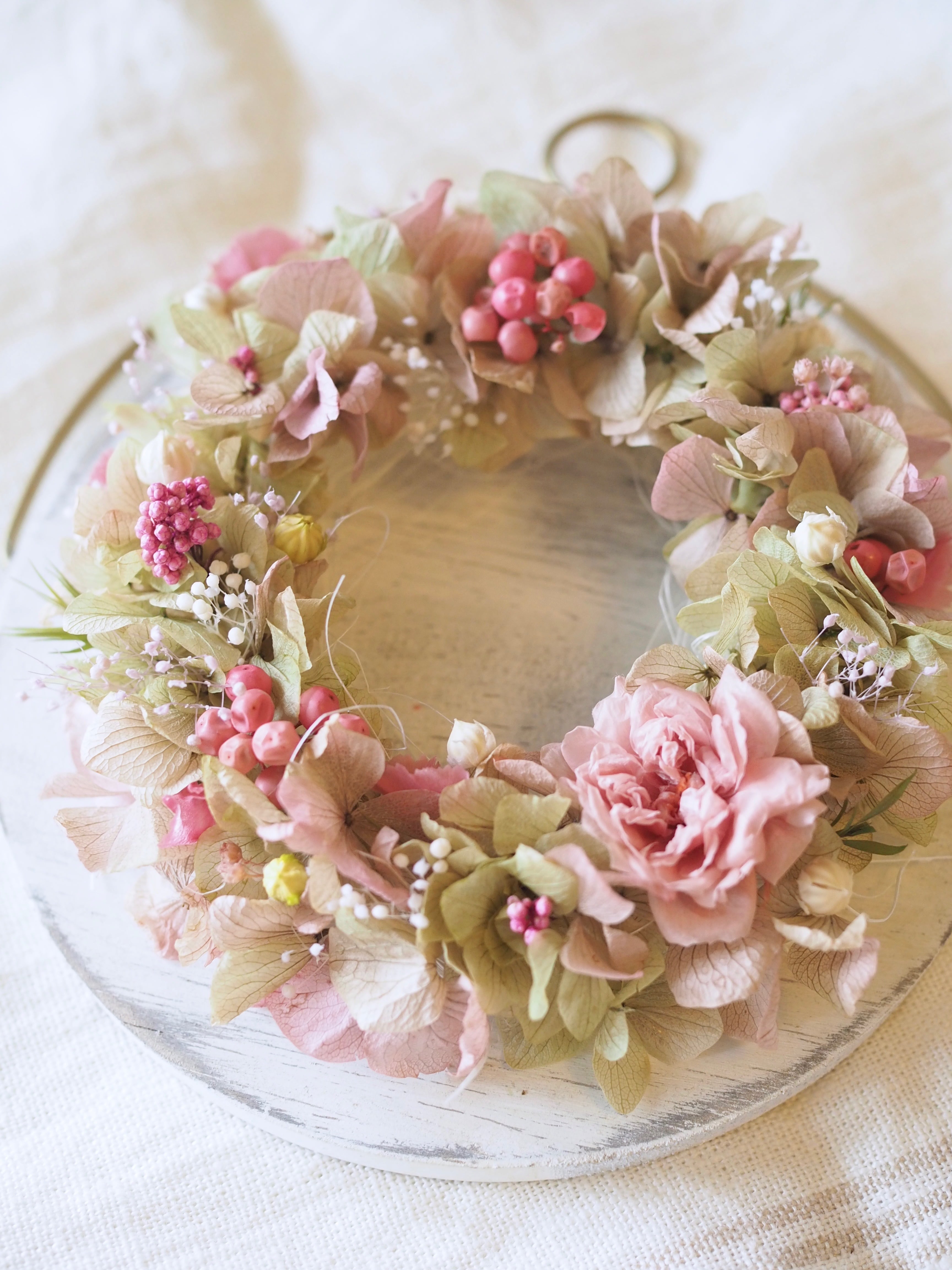 目に入るとふっと気分を柔らかく華やかにしてくれるような色合いのリース♡