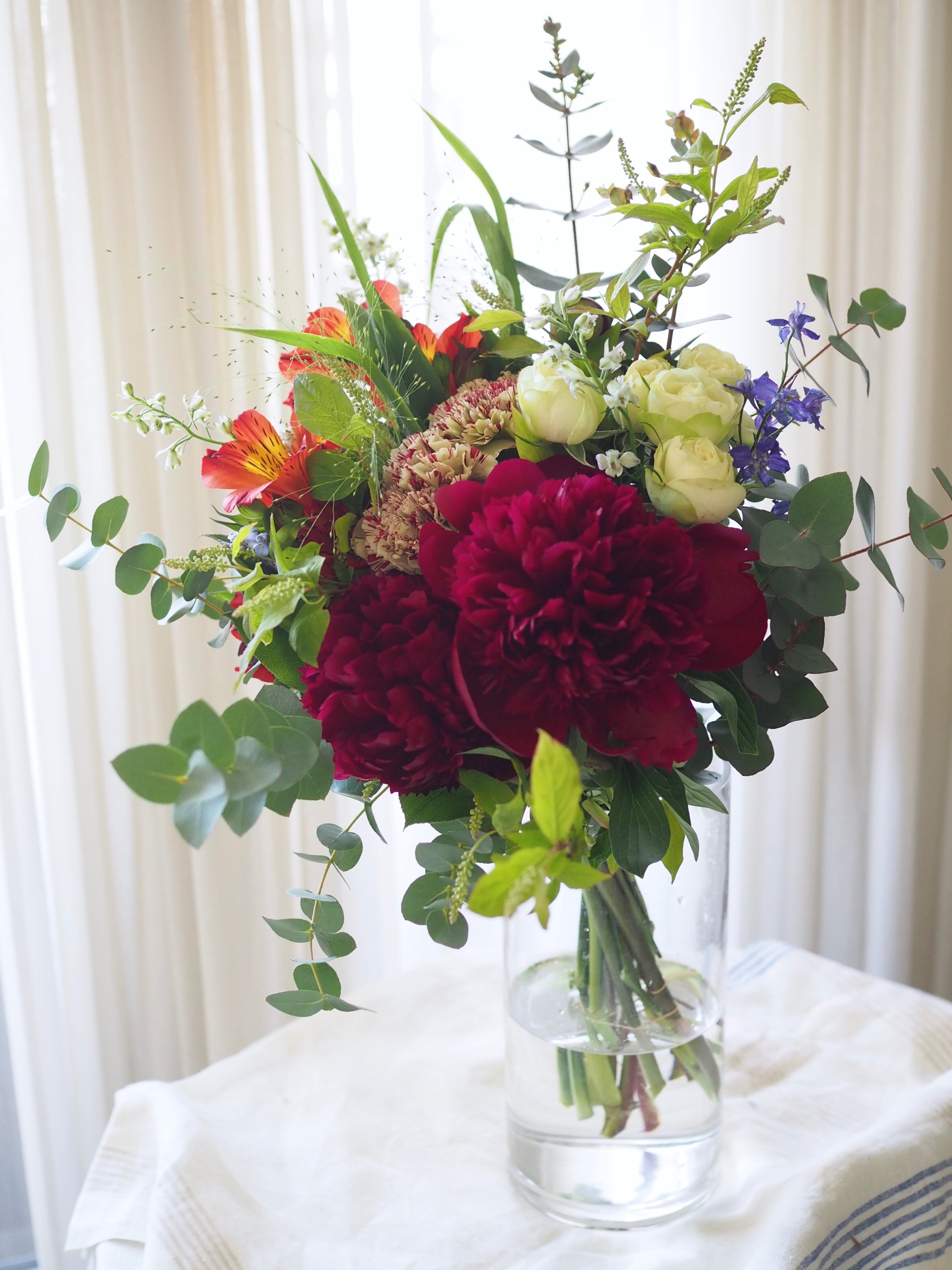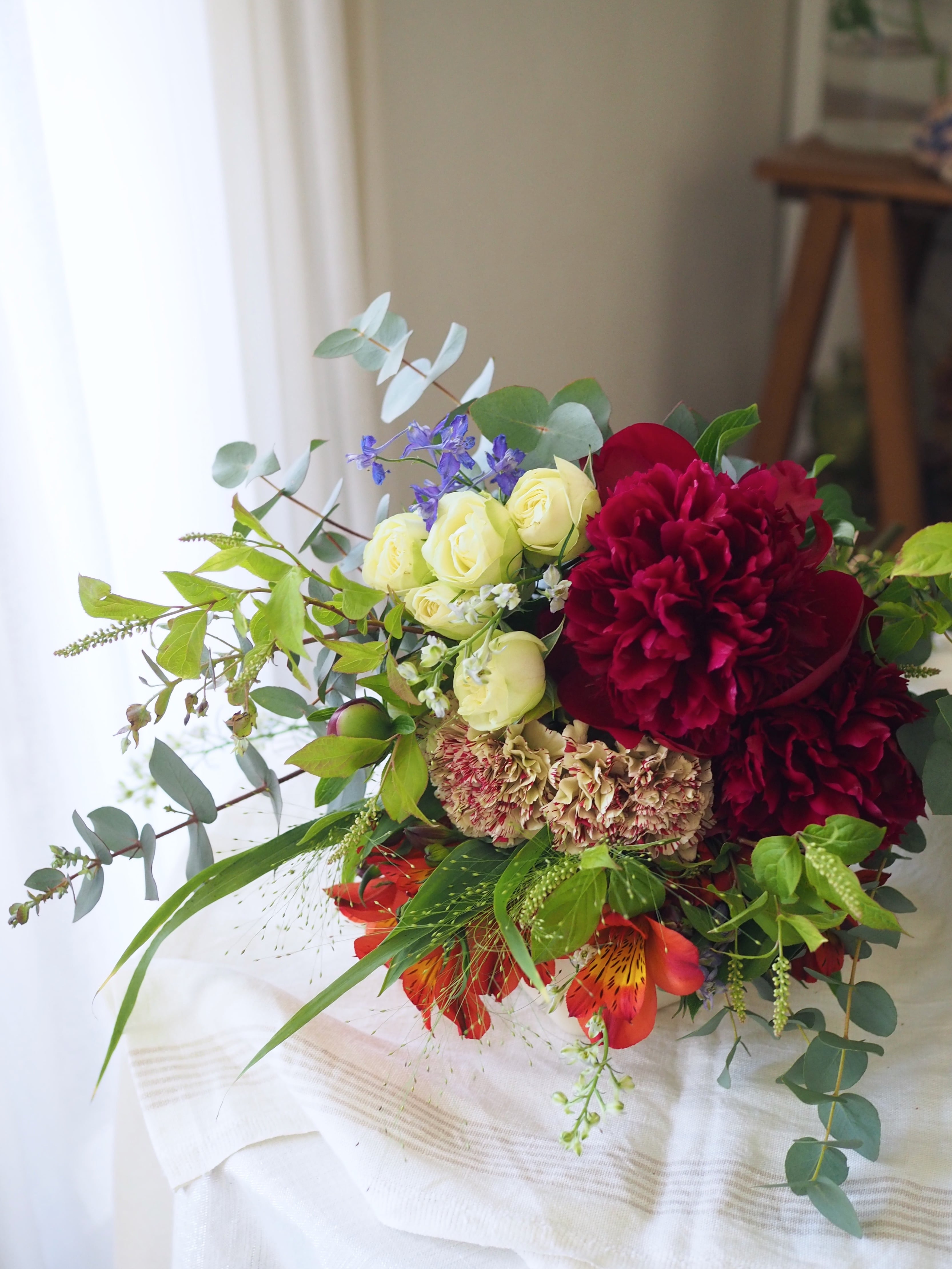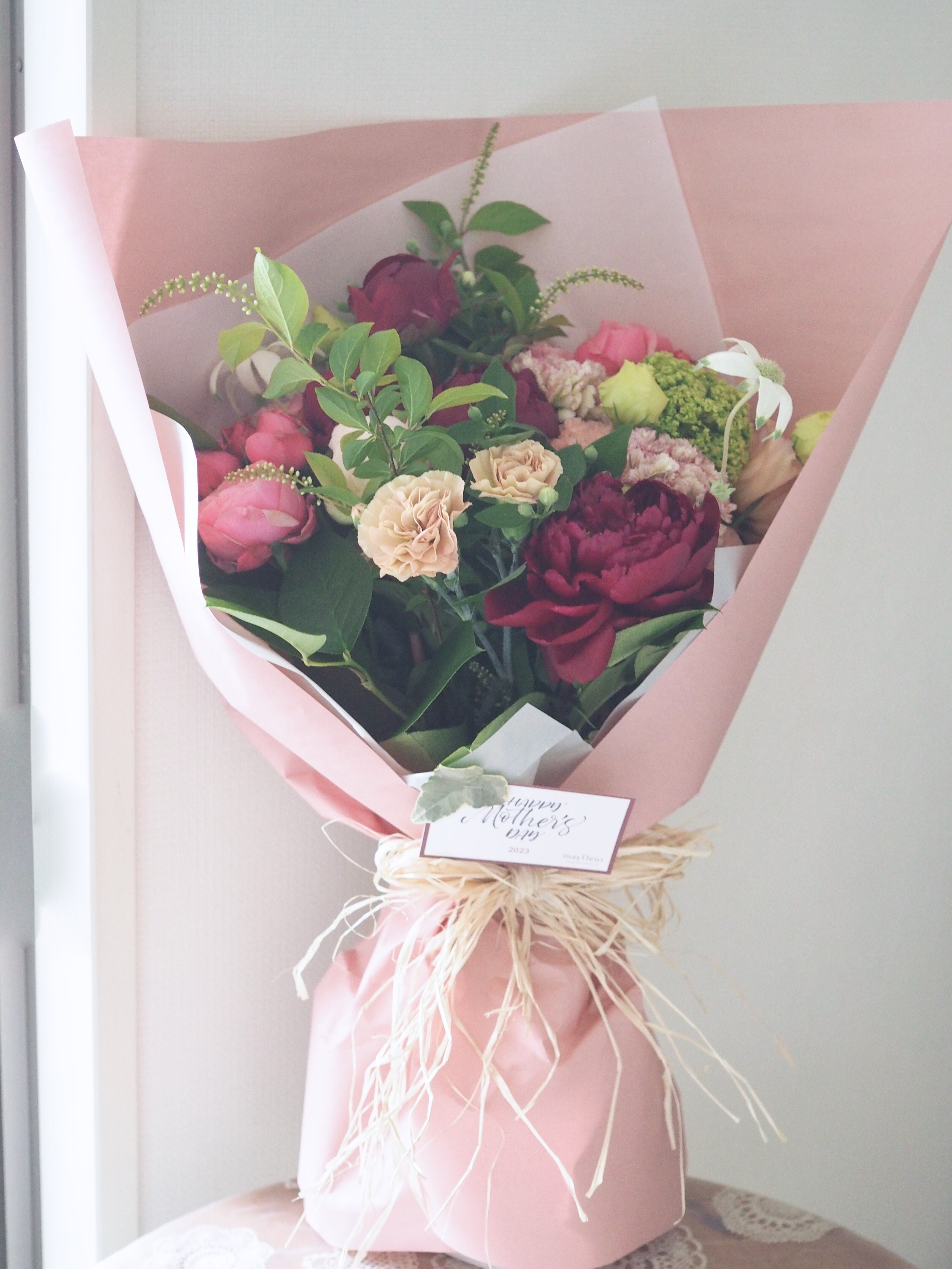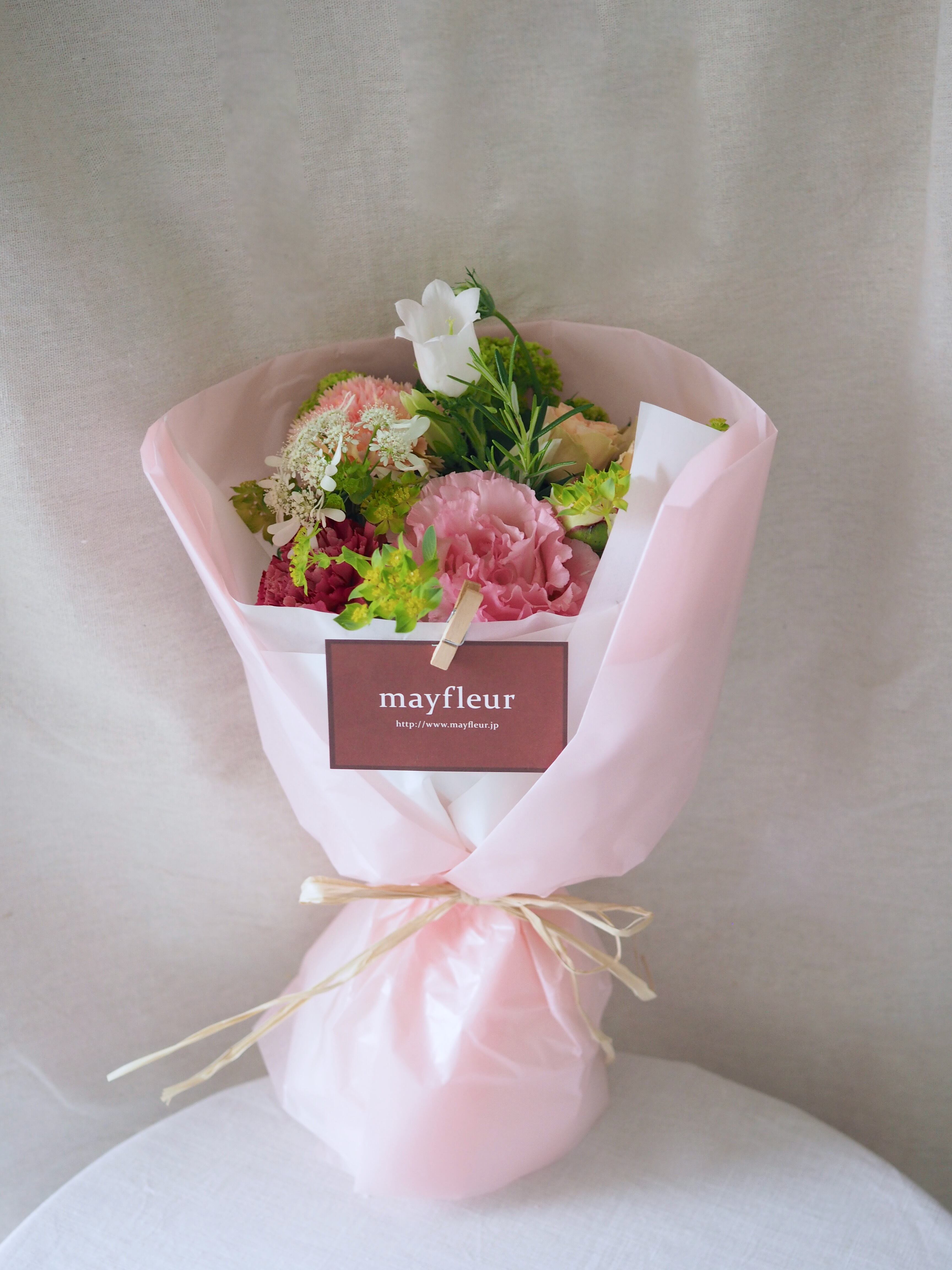 芍薬をメインにカーネーションや季節のお花とたっぷりのグリーンを合わせて束ねます。