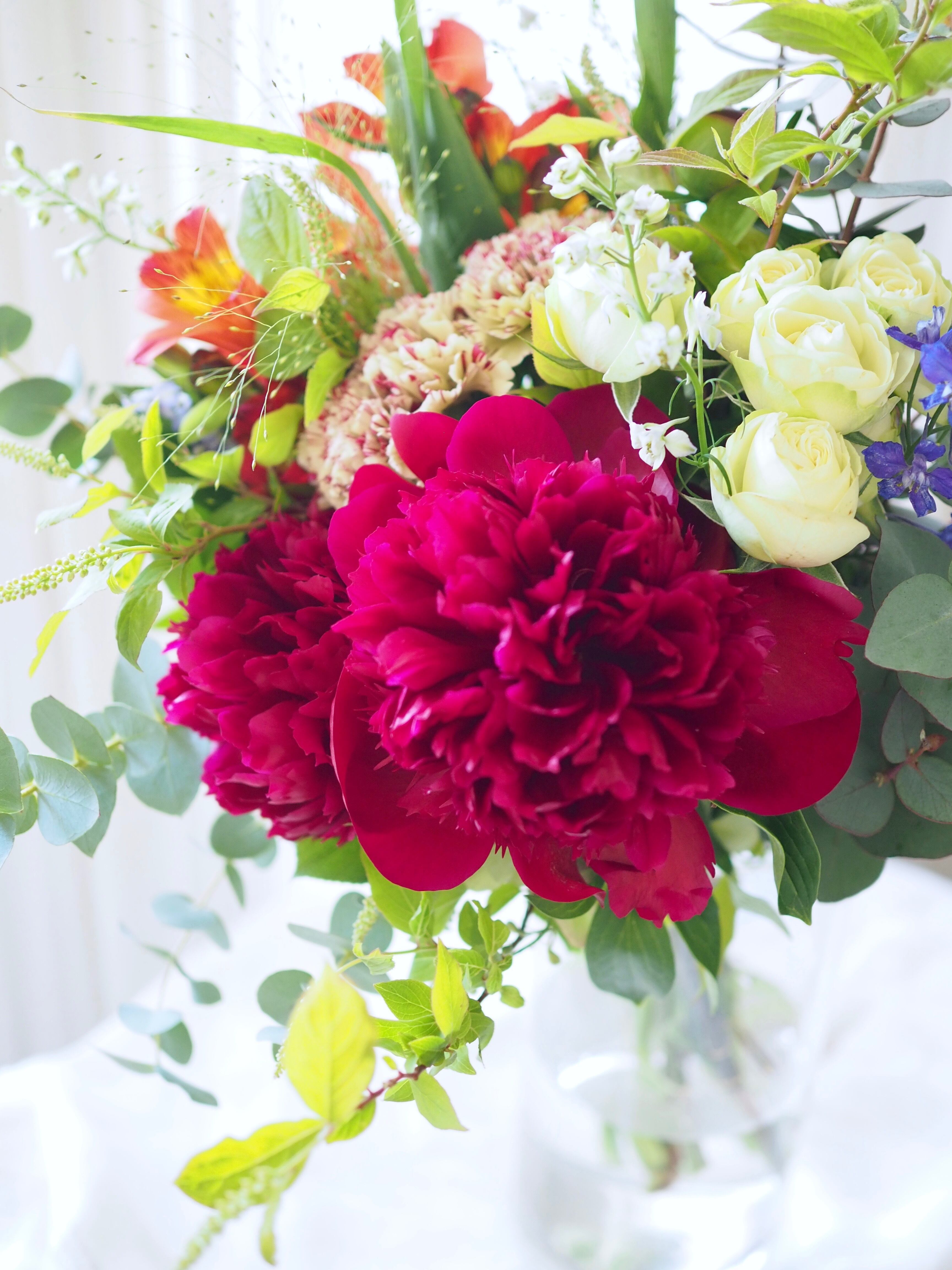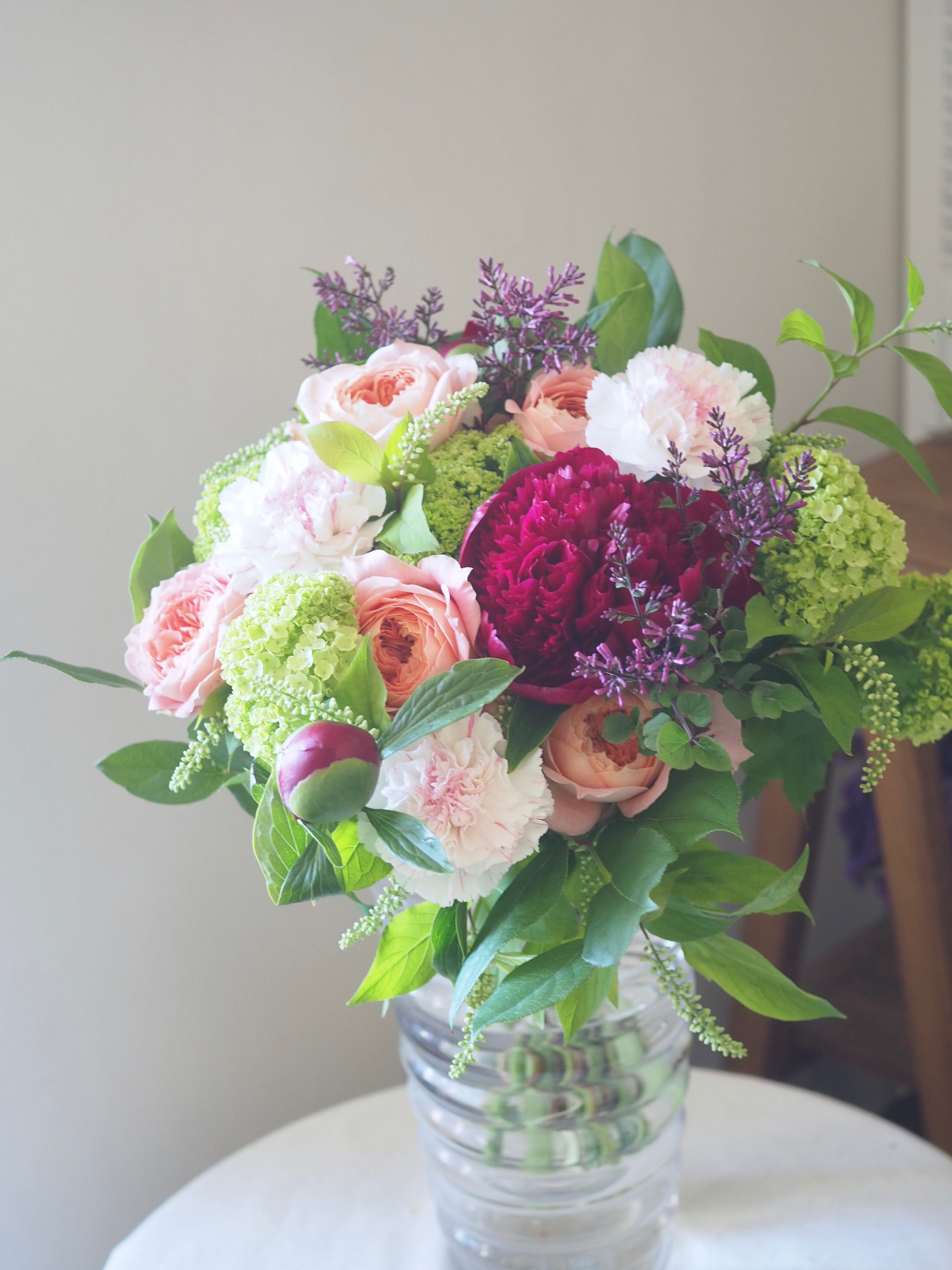芍薬をメインにカーネーションや季節のお花とたっぷりのグリーンを合わせて束ねます。